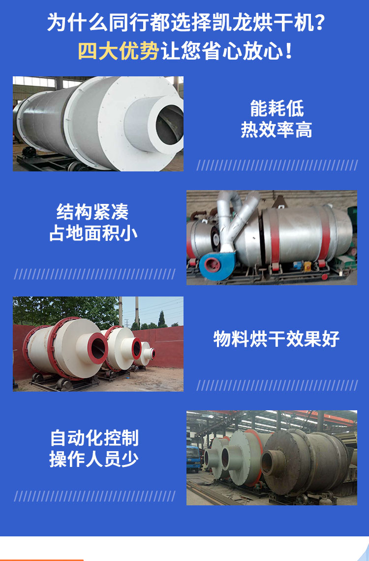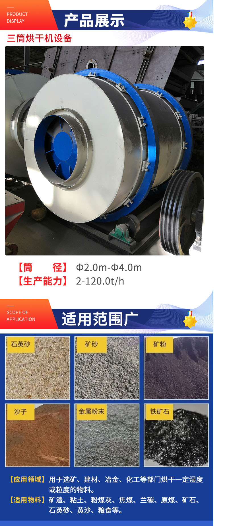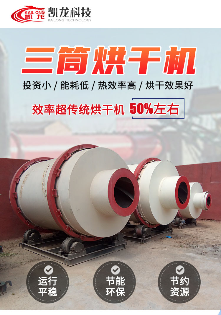 三筒式烘干機(jī)具有結(jié)構(gòu)緊湊、構(gòu)造簡(jiǎn)單、布局合理,提高物料與熱能的熱交換率,使物料烘干效果好;基礎(chǔ)投入少,僅是相同產(chǎn)量單筒烘干機(jī)的二分之一,減少了一次性投入;運(yùn)行可靠、能耗低、熱效率高;同時(shí),容易實(shí)現(xiàn)自動(dòng)化控制,減少操作人員,節(jié)約勞動(dòng)力資源。