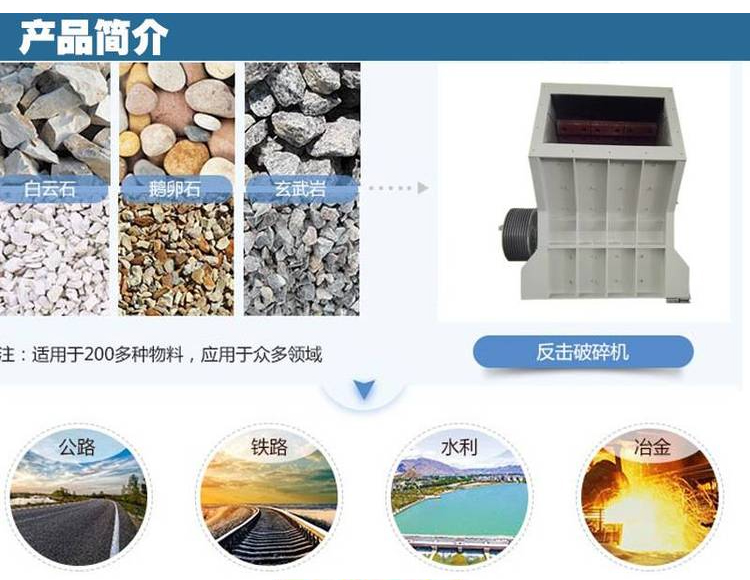 反擊式破碎機(jī)采用了特別的結(jié)構(gòu)設(shè)計(jì),成品呈立方體,粒型相當(dāng)好,能破碎抗壓強(qiáng)度不超過(guò)350MPa的各種物料如花崗巖、石灰石等,廣泛應(yīng)用于各種礦石破碎、鐵路、高速公路、建筑等行業(yè)。