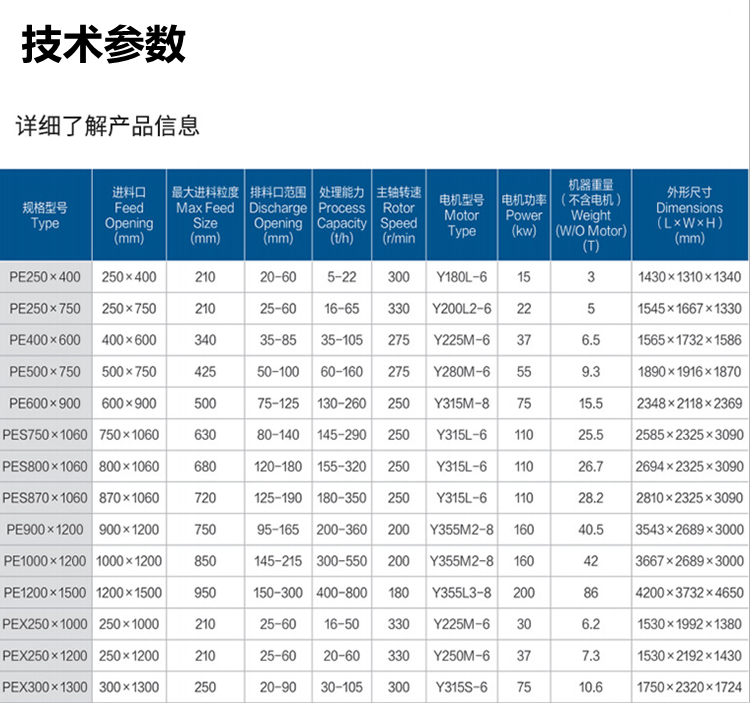 破碎機(jī)按其外形規(guī)格尺寸及時產(chǎn)量高低的不同,�?蓜澐殖龊芏嘁�(guī)格型號,另外,為了滿足部分高要求客戶生產(chǎn)需求,市場現(xiàn)又推出了一類移動式鄂破機(jī),鄂破機(jī)參數(shù)詳情如下表: