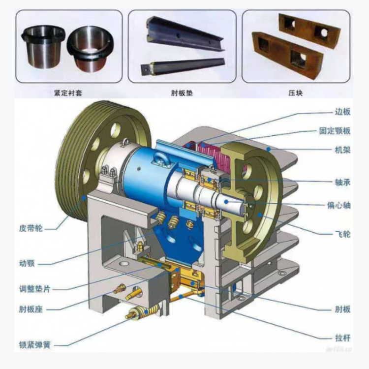 顎式破碎機(jī)配件也可稱為顎式破碎機(jī)易損件,是顎破機(jī)重要的組成部分;在一定的周期范圍內(nèi)需要更換�?煞譃轭板、肘板、邊護(hù)板、齒板、三角帶等。